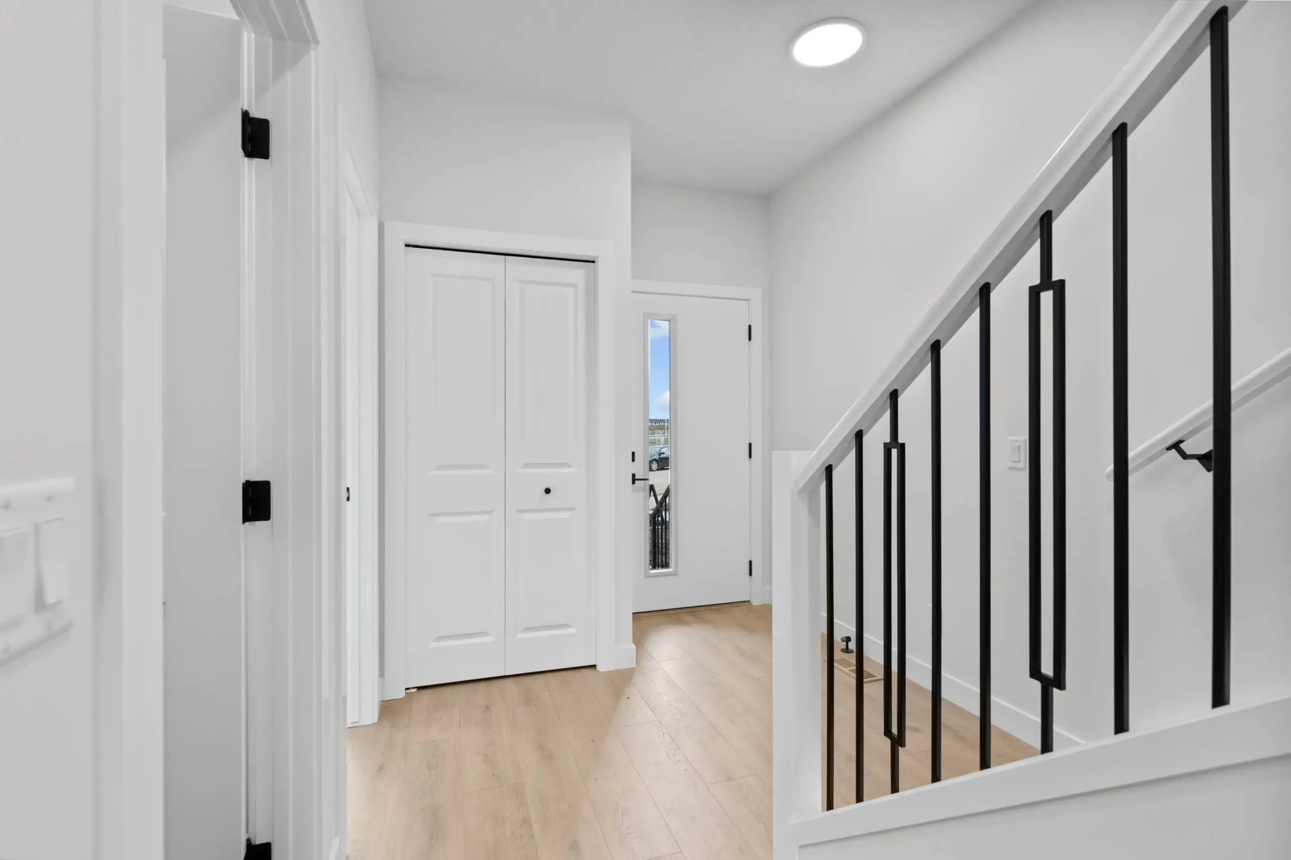 This modern farmhouse elevation showcases a charming design with hardy board exterior, front landscaping. The spacious 1,900 sq. ft. layout includes four bedrooms and three bathrooms, featuring a convenient main floor bedroom and full bathroom. It boasts a functional spice kitchen, an inviting electric fireplace, full ceiling height cabinets with soft-close drawers, and stainless steel appliances, washer and dryer included. Additional highlights include a 9-foot basement with a side entrance, a cozy 5’x4′ pressure-treated wood deck, knockdown ceilings, and a two-car gravel pad, making it an ideal choice for contemporary living.